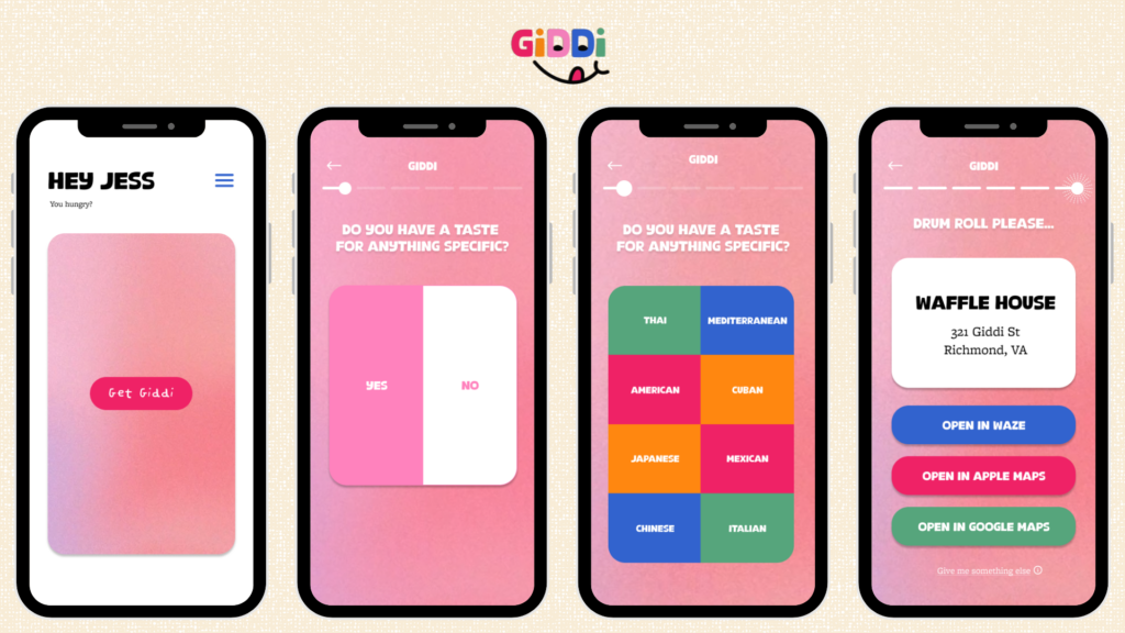 Giddi helps indecisive eaters overcome mealtime anxiety by eliminating decision paralysis. The app is designed to consider users’ preferences, such as type of meal and dietary restrictions, as well as their location, to determine viable food choices in their area. Gabby’s personal passion for supporting small businesses also informed the app’s design, ensuring that local restaurants are promoted.