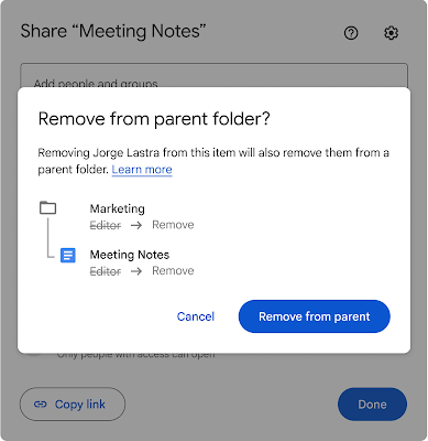 Additionally, starting on September 22, 2025, the “Editors can change permissions and share” setting will also change. Turning the setting off will still prevent users with Editor access from sharing the item directly, but if the owner places the item into a shared folder, any changes to the containing folder’s access will be applied on the item. Previously, those changes were only applied if the item’s owner was the one making the folder access change.