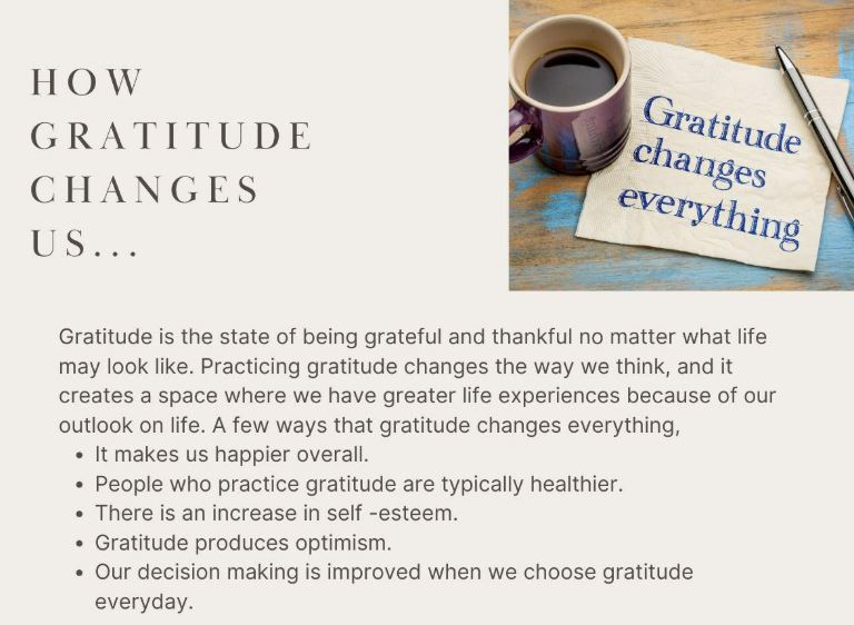 Life sometimes throws us some unexpected curves and it can be hard to see all of the good that we experience. By practicing gratitude, we have the ability to change the way we think about our lives. Gratitude is simply being grateful and thankful for the smallest things in life. Finding joy in those things helps to shift our focus to all that we have to be thankful for. Today let’s take some time to celebrate all of the good that we have going on no matter how small.