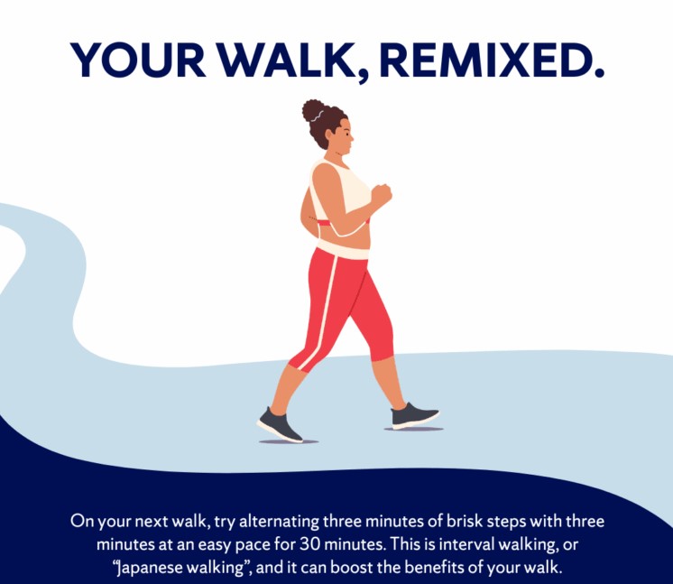 Known more formally as interval walking training, it alternates 3 minutes of brisk walking with 3 minutes at an easy pace for 30 minutes. This simple rhythm helps boost the many benefits of your daily walk.