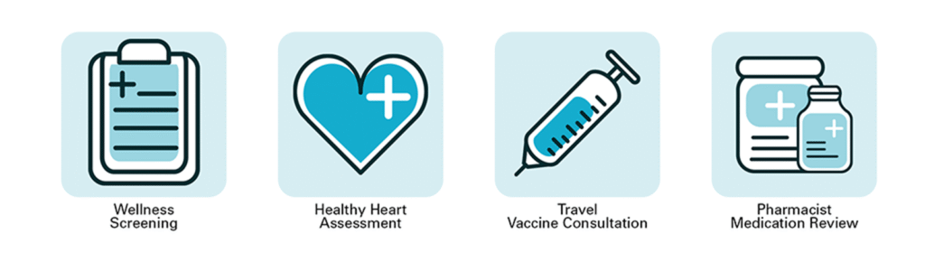 - Wellness appointments, including wellness screenings, healthy heart assessment, travel vaccine consultation, diet and nutrition consultation, and pharmacist medication review