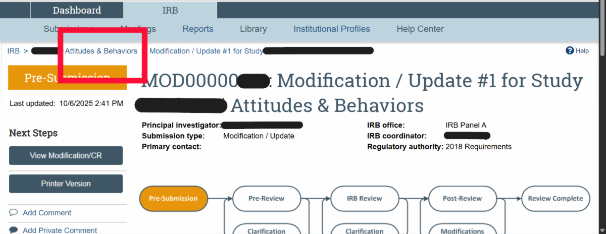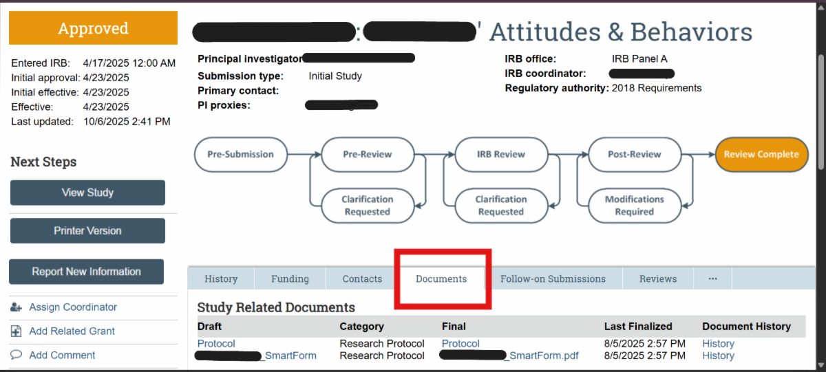 | Ancillary Reviews (Current status for AR functionality; reminder error – awareness only; department reviews) VIRBs has a built-in feature for completing required Ancillary Reviews within the history of the VIRBs protocol. Currently, the Departmental Review requirement for Expedited and Full Board Studies is the only Ancillary Review that may be completed in VIRBs. The HRPP will notify the research community when any new features become available in VIRBs. Refer to the New IRB review system: VIRBs (VCU IRB system) web page under ‘Ancillary review process‘ for guidance on Department Head Reviews. The Department Head Ancillary Review in VIRBs video demo is available on the HRPP Kaltura channel. To note, VIRBs does not automatically prompt the research team to complete Departmental Review for Expedited and Full Board studies. This is a change from the previous review system. As part of the VIRBs intake process, the IRB immediately returns initial Expedited and Full Board submissions to the research team if Departmental Review is not complete. *Known Error* Ancillary Review Reminders The HRPP is aware of reminder notifications being prompted in the history of VIRBs submissions. Research teams only need to complete the Ancillary Review activity in VIRBs for initial review of Expedited and Full Board studies, or when required to do so as part of the IRB’s review process for a specific protocol. For all other studies, please disregard the automatic notification for ‘VCU Ancillary Review Reminder’ in VIRBs. Location for approved (date stamped) consent forms Make sure you check the ‘Documents’ tab in the submission for the finalized, stamped version, as that version does not auto-populate in the SmartForm. ![]() If you have a Modification to the Consent form that is in progress and need to retrieve the currently approved (stamped) version of the consent form, you will need to navigate to the ‘title’ of the study in the breadcrumbs and navigate to the ‘Documents’ tab that contains all currently approved documents. ![]() VIRBs Library The VIRBs library is a feature built into VIRBs for direct retrieval of the most up to date versions of the HRPP Toolkit materials, such as SOP’s, protocol and consent templates, and other supporting materials for the IRB’s review process. The VIRBs library will be updated when new versions become available. The HRPP also publishes updated HRPP Toolkit materials on the HRPP Policies and Guidance web page. ![]() VIRBs Notifications VIRBs is not designed to send auto-notifications for every activity completed. VIRBs includes a built-in flow diagram for tracking of the submission through the IRB’s review process. VIRBs sends auto notifications when comments are logged, when clarifications are needed, and for studies that have been approved by the VCU IRB. For reliance studies receiving review by an external IRB, the VIRBs review process is abbreviated, as it is specific to the processing of external submissions and formal institutional agreements for collaborating studies. VIRBs does not currently send notifications out when external submissions are complete. The HRPP Reliance team has been logging comments to the research teams once external reviews have been completed in VIRBs. |