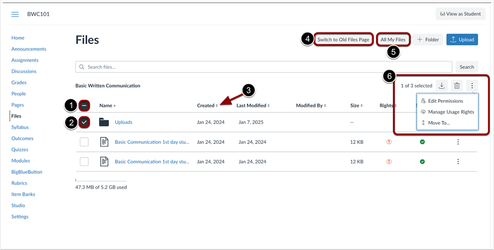 To select all files and folders at once, click the Select All checkbox [1]. To select files or folders individually, use the checkbox next to each file or folder[2]. Column headers can be clicked to sort files and folders [3]. To switch between the new and original Files page, click the Switch to Old/New Files Page button [4]. To view the files landing page, click the All My Files button [5]. Bulk action options are available when files and/or folders are selected [6].