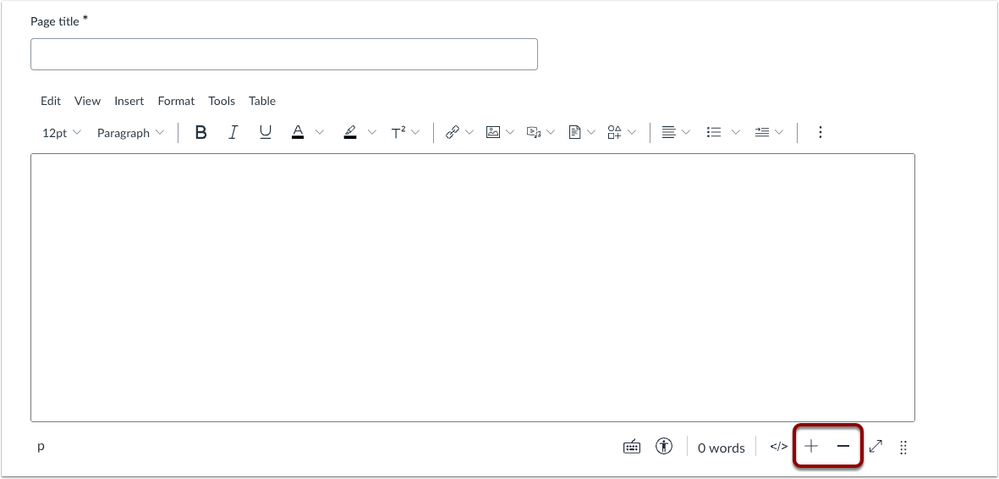 The Rich Content Editor (RCE) includes a plus and minus icon to resize the editor. This update improves accessibility by adding icons that let users easily resize the editor, providing an alternative to the previous drag-to-resize option. Use the plus and minus icons to resize the RCE.