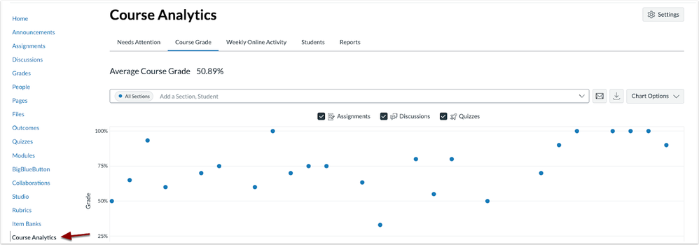 The New Course and User Analytics feature option is renamed Course and User Analytics. Additionally, in courses, New Analytics text is updated to Course Analytics. This update improves clarity and consistency. Removing New from the feature option name helps avoid confusion, especially as the feature becomes more established. It signals that this is now the standard version of Course and User Analytics.