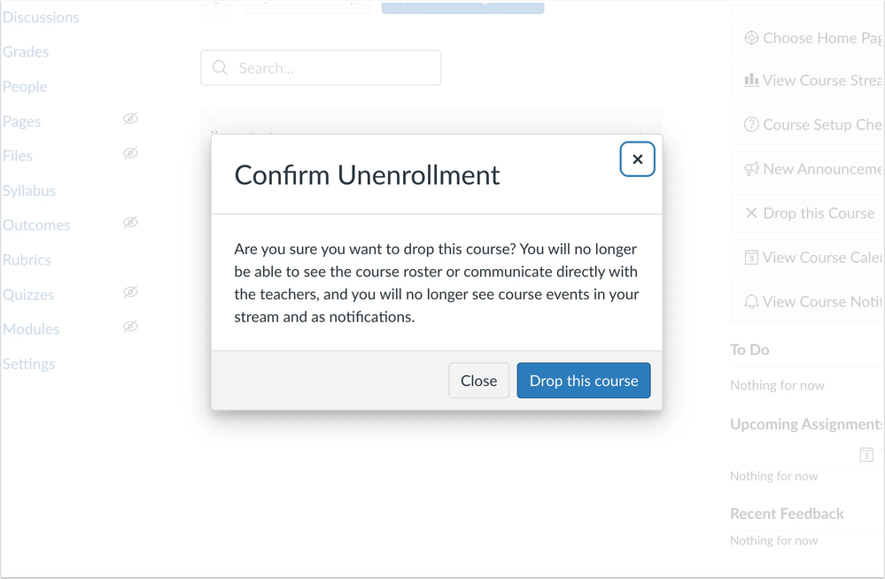 The Confirm Unenrollment modal for self-enrolled courses is updated with the latest version of InstUI. This update allows users to experience a modern, consistent interface when unenrolling from self-enrolled courses, improving clarity and usability. An updated modal interface displays when dropping a course.