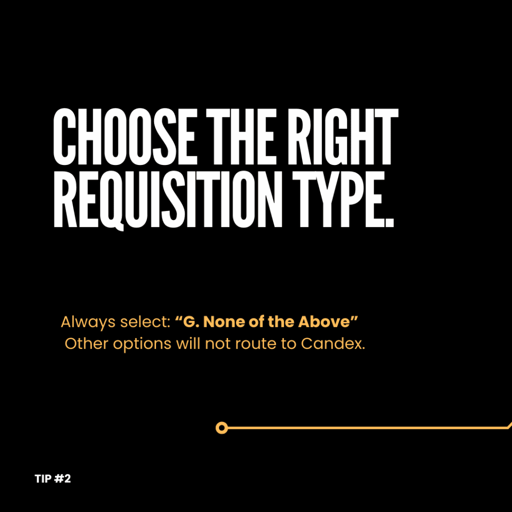 - If a different requisition type is selected, the order will not be routed to Candex, which can result in delays or errors.
