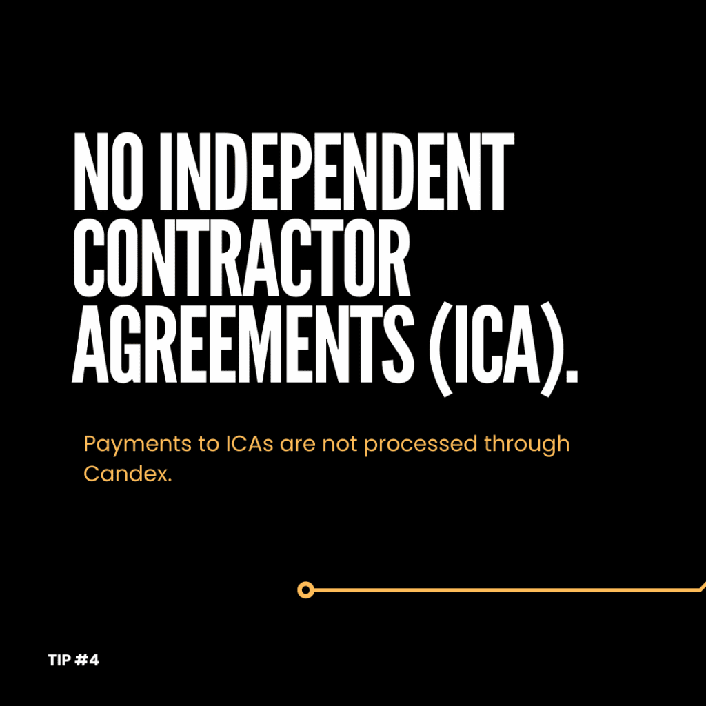 Payments to Independent Contractor Agreements (ICAs) should not be made using Candex.