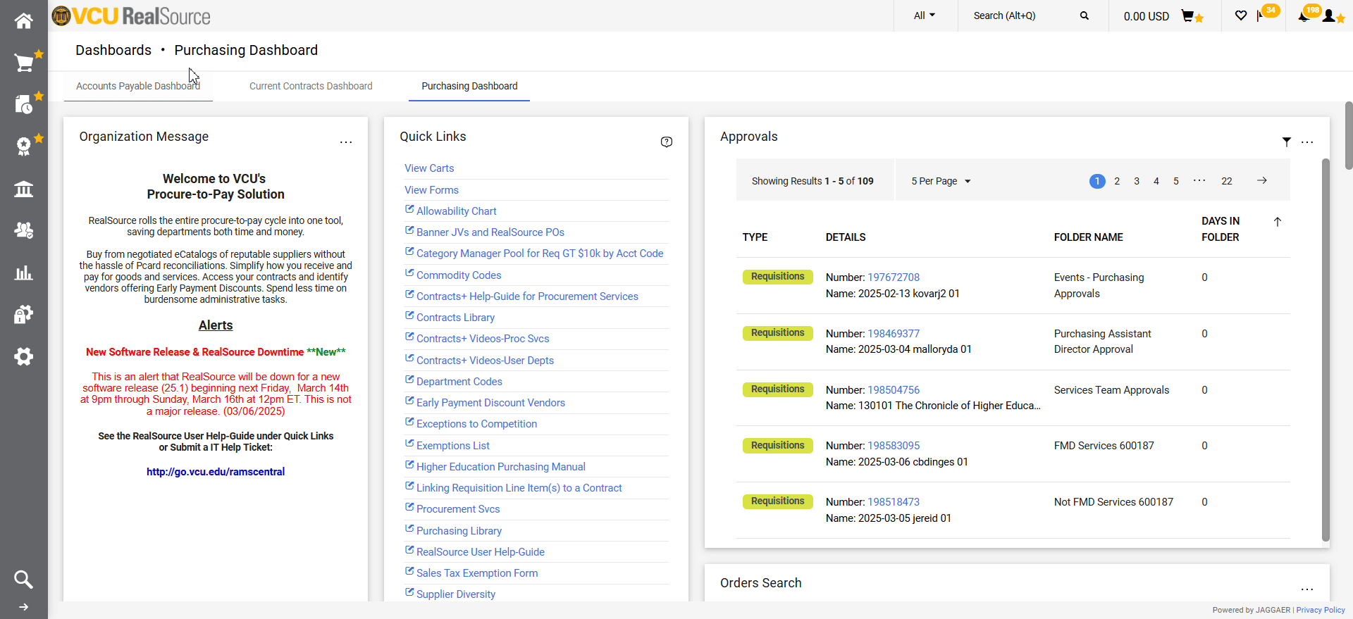 Searching made easy! The RealSource Search feature is designed to help you quickly find and manage your purchase orders. With five pre-built searches—like Open POs, Discounts Requiring a Receipt, and Invoices Requiring Receipts—you can narrow your focus and find the exact info you need. Just use the orders icon and filter by department to make your search even easier. And, with University Wide Searches, everyone at VCU is on the same page!