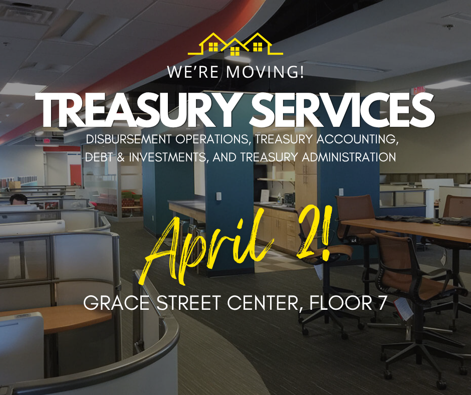 The Disbursement Operations, Treasury Accounting, Debt & Investments, and Treasury Administration teams within Treasury Services are heading to a new space, and we can’t wait to welcome you. Starting April 2nd, you can find us at the Grace Street Center on the 7th floor.
