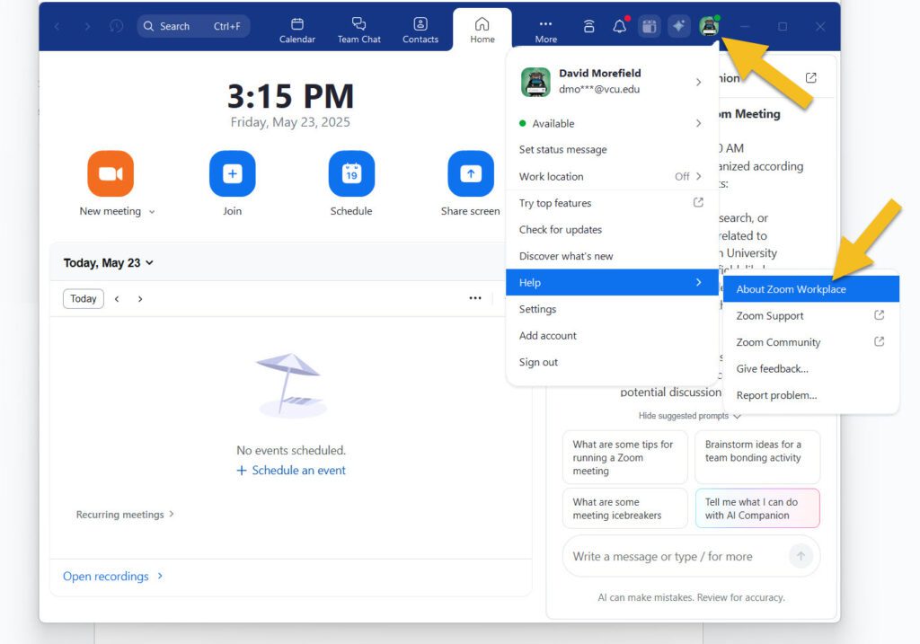 Updating Zoom is typically a quick and easy process, but in order to avoid any inconvenience you may wish to take a moment to upgrade before this rule takes effect. As a reminder, you can verify your current software version by opening the Zoom desktop app, then clicking on your profile picture (or initials) at the top right of the application window and choosing “Help > About Zoom Workplace” from the pull-down menu.